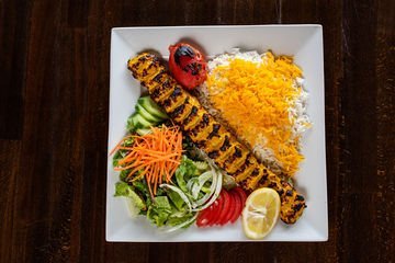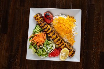Fried and cooked chunks of beef tenderloin mixed with green beans and cooked basmati rice, served with a skewer of beef koobideh or chicken koobideh and a BBQ tomato.