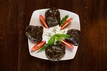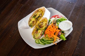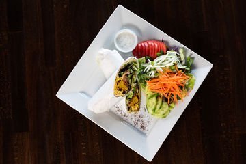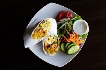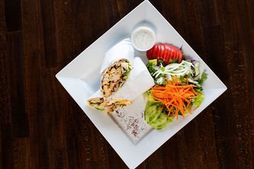 Cornish game hen marinated in lemon juice and ground herbs, skewered, broiled over open fire to perfection and served with steamed basmati rice and B.B.Q. tomato. All natural.