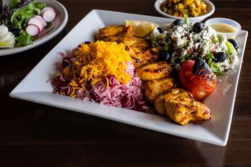 Succulent pieces of chicken tender marinated in lemon juice and saffron, skewered and broiled over open fire to perfection, with BBQ tomato. All Natural.